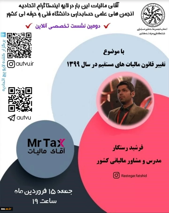 مدرس و مشاور مالیاتی کشور، در روز جمعه ۱۵ فروردین ۹۹ به صورت پخش زنده از صفحه اینستاگرام اتحادیه برگزار شد.