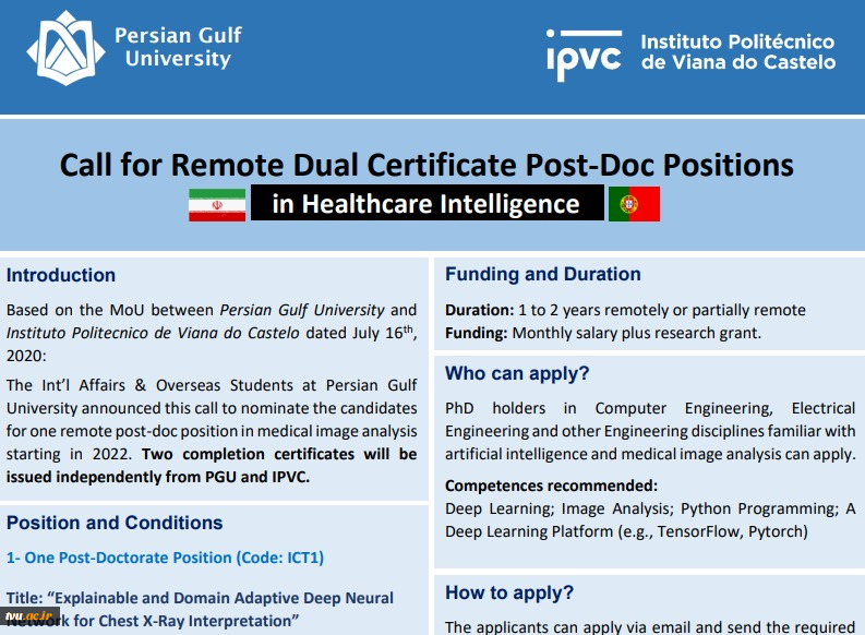 به اطلاع دانش آموختگان دکتری واجد شرایط می رساند؛ دانشگاه خلیج فارس قصد دارد در برنامه مشترکی با دانشگاه IPVC پرتغال، یک محقق پسادکتری در حوزه هوش مصنوعی با موضع تحقیق "هوش مصنوعی در تفسیر تصاویر اشعه ایکس قفسه سینه" جذب میشود. علاقمندان میتوانند جهت کسب اطلاعات بیشتر به پیوست مراجعه کنند.